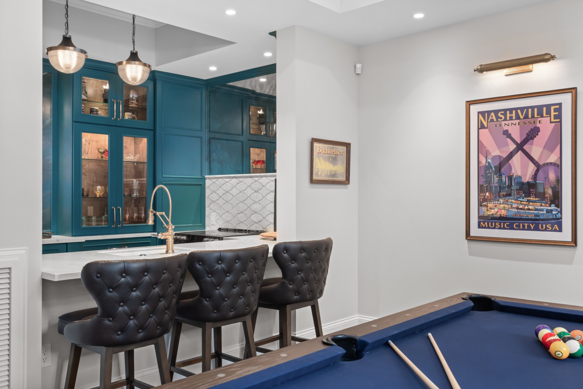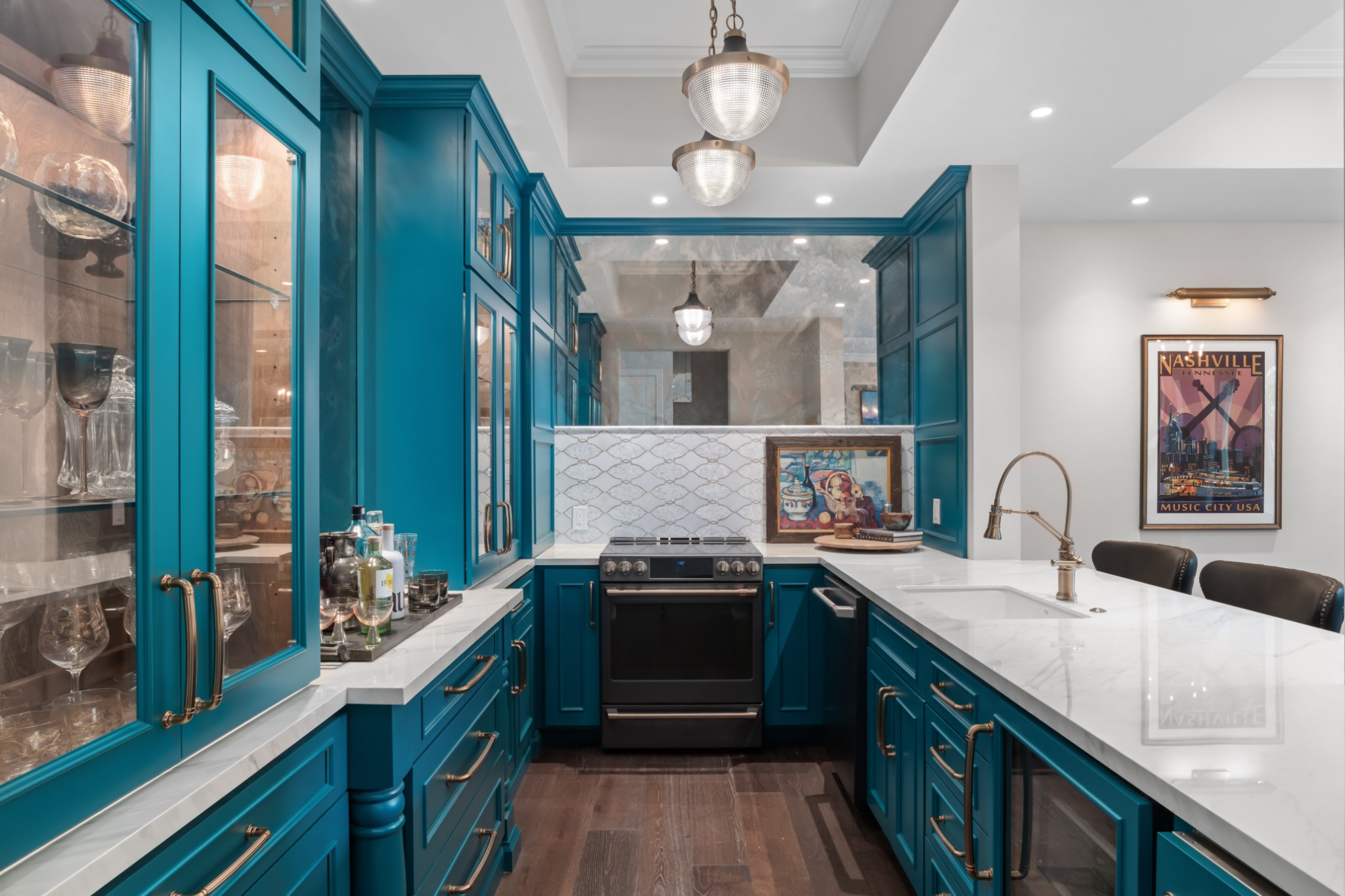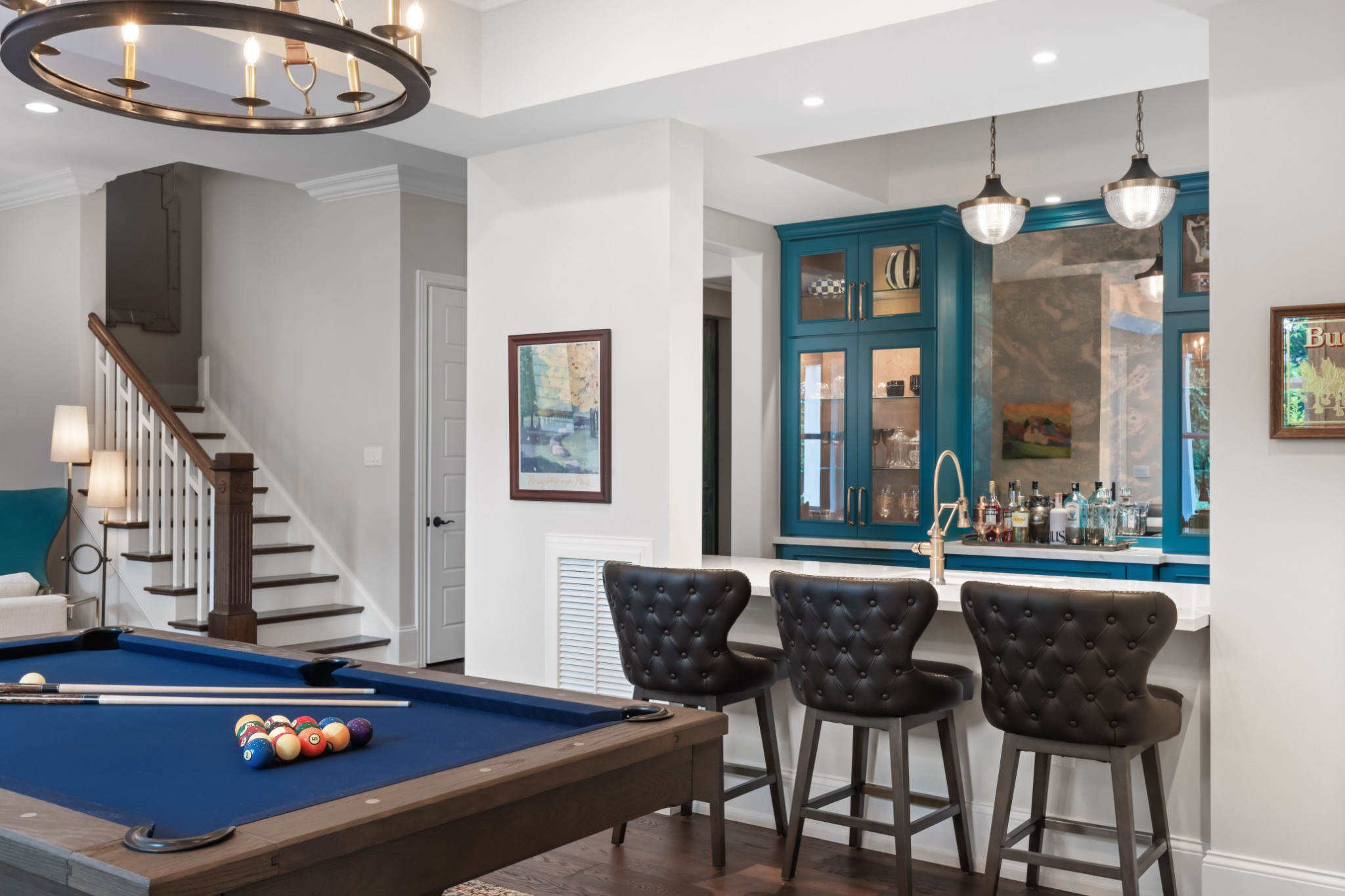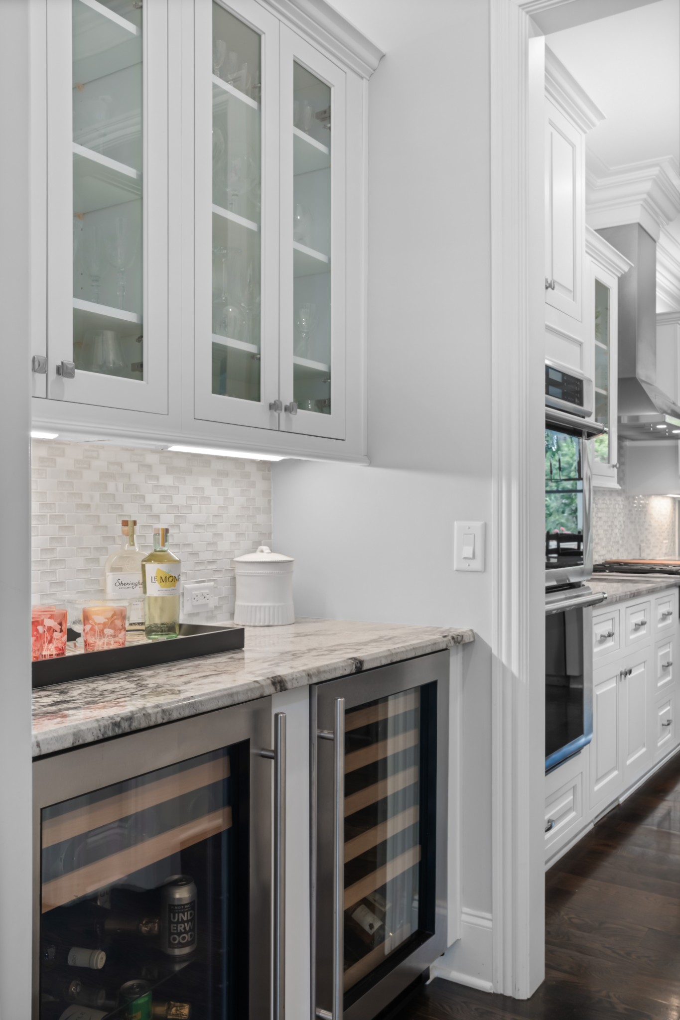 The show-stopping ground level renovation (2022) features a temperature-controlled wine cellar, expansive entertainment area with full kitchen/bar, versatile hobby room or 5th bedroom, zen fitness studio, and an additional 550 sq. ft. of workshop space and storage room (not included in total square footage).