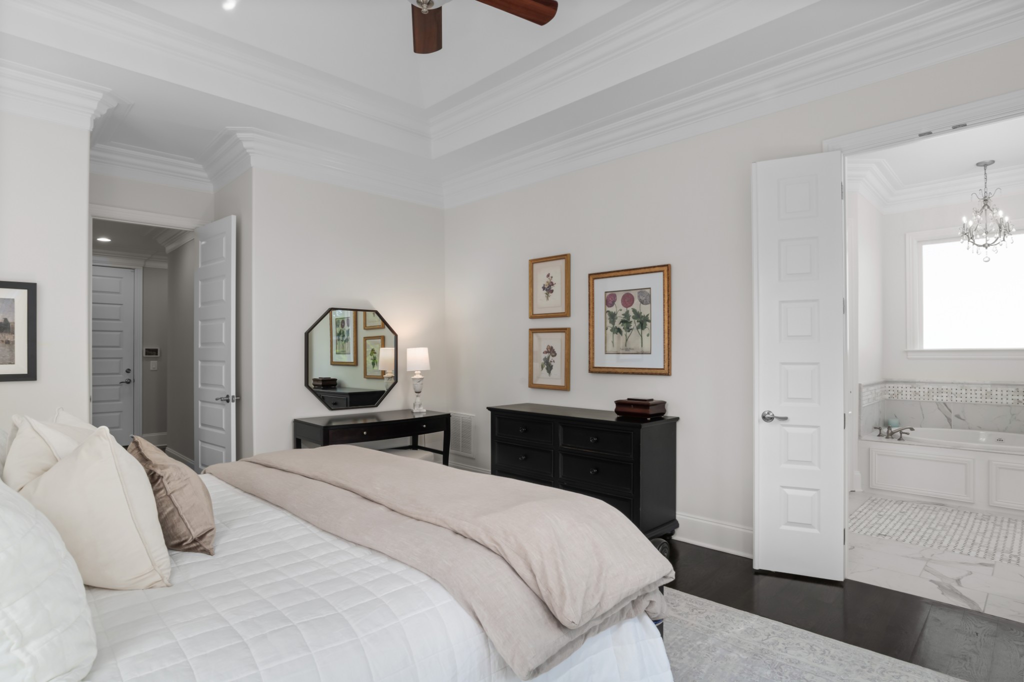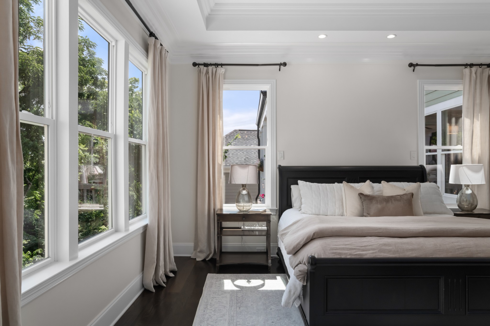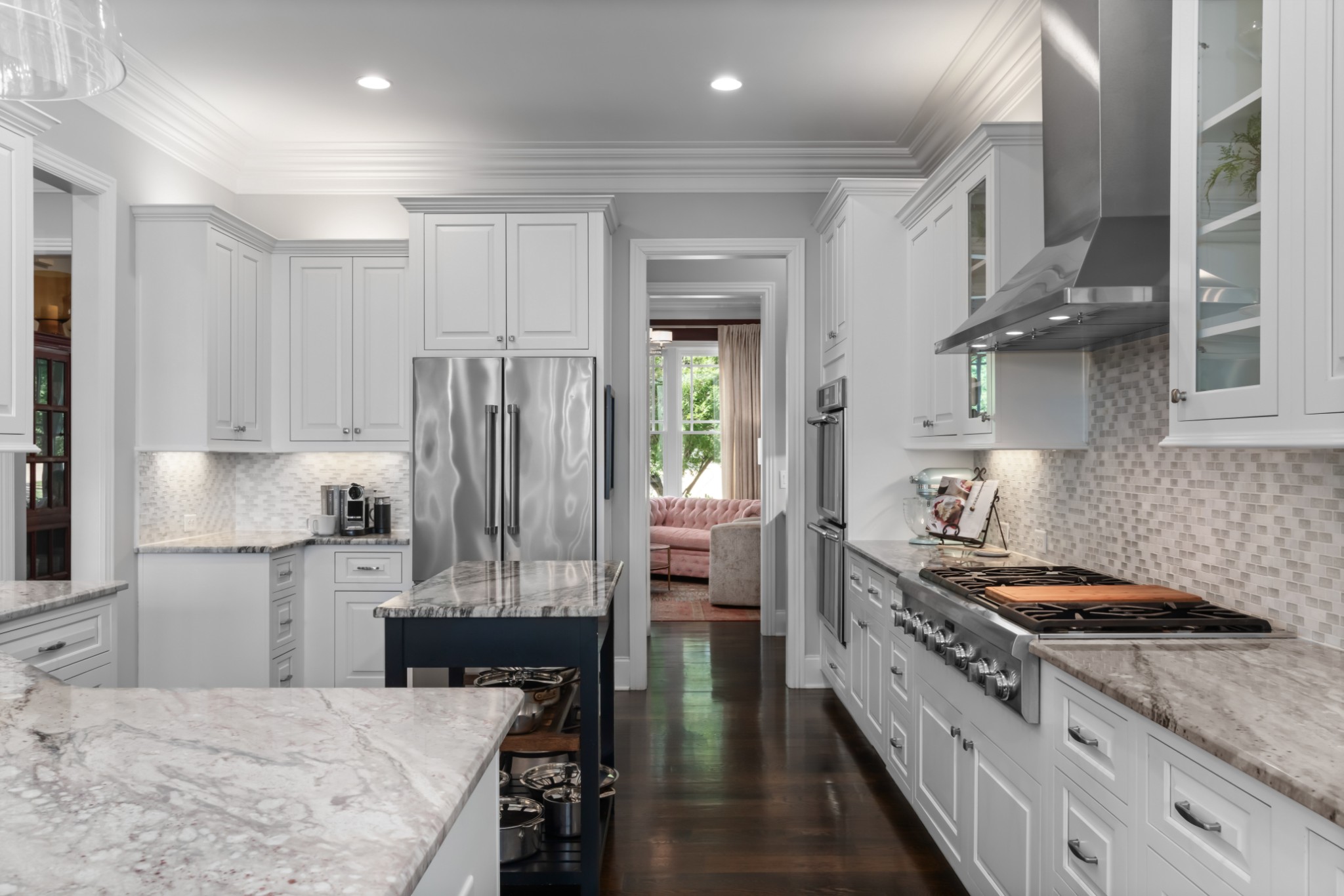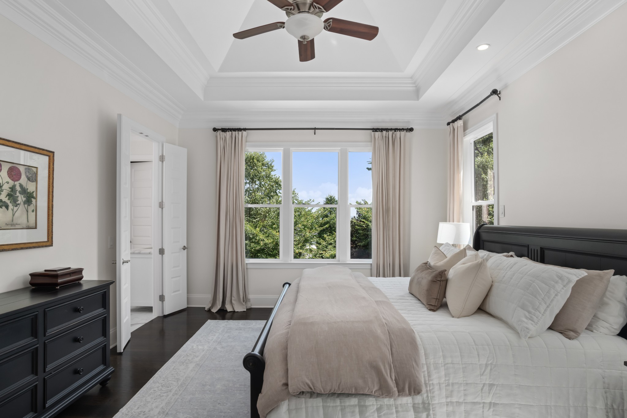 The home's first level offers thoughtfully appointed living and dining areas, a keeping room, an open chef's kitchen with Thermador appliances, and a light-filled primary suite with soaking tub and dual closets. The second level features an airy living room, an executive's office, and three ensuite bedrooms.