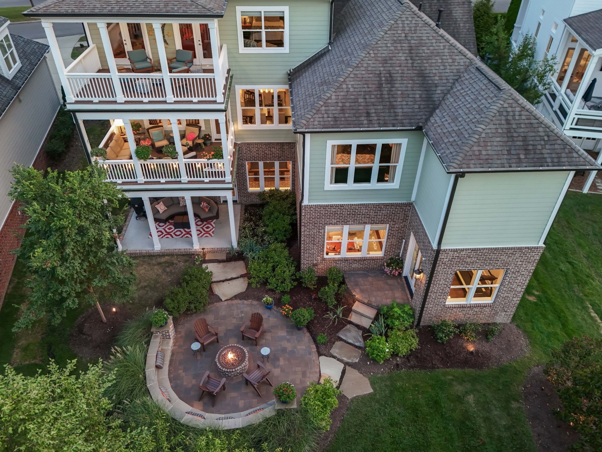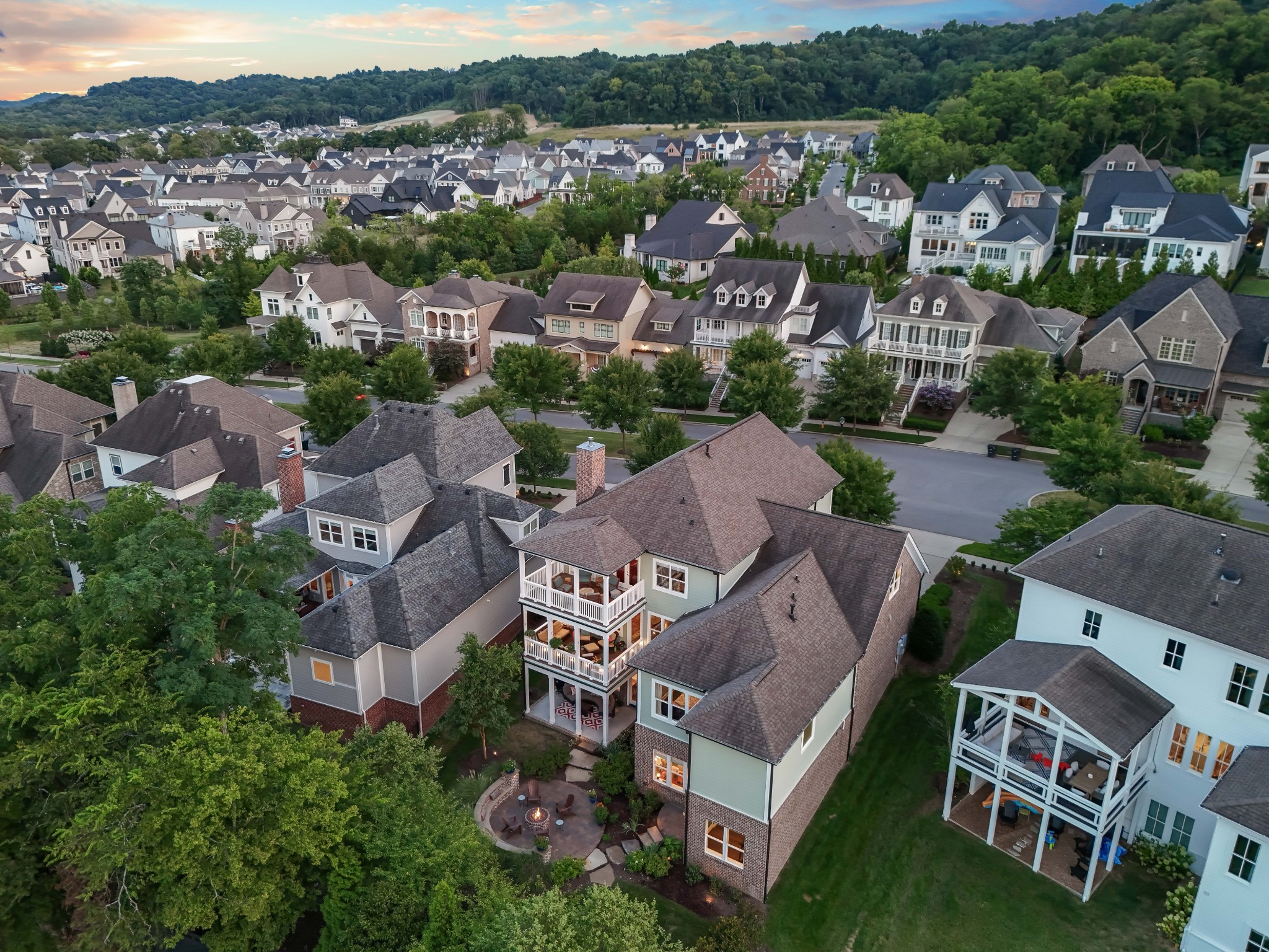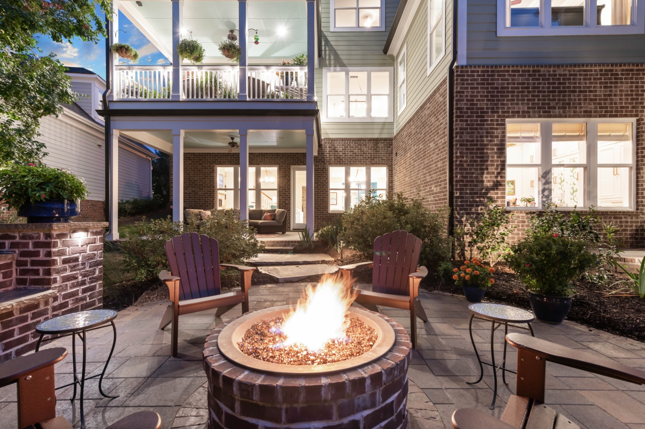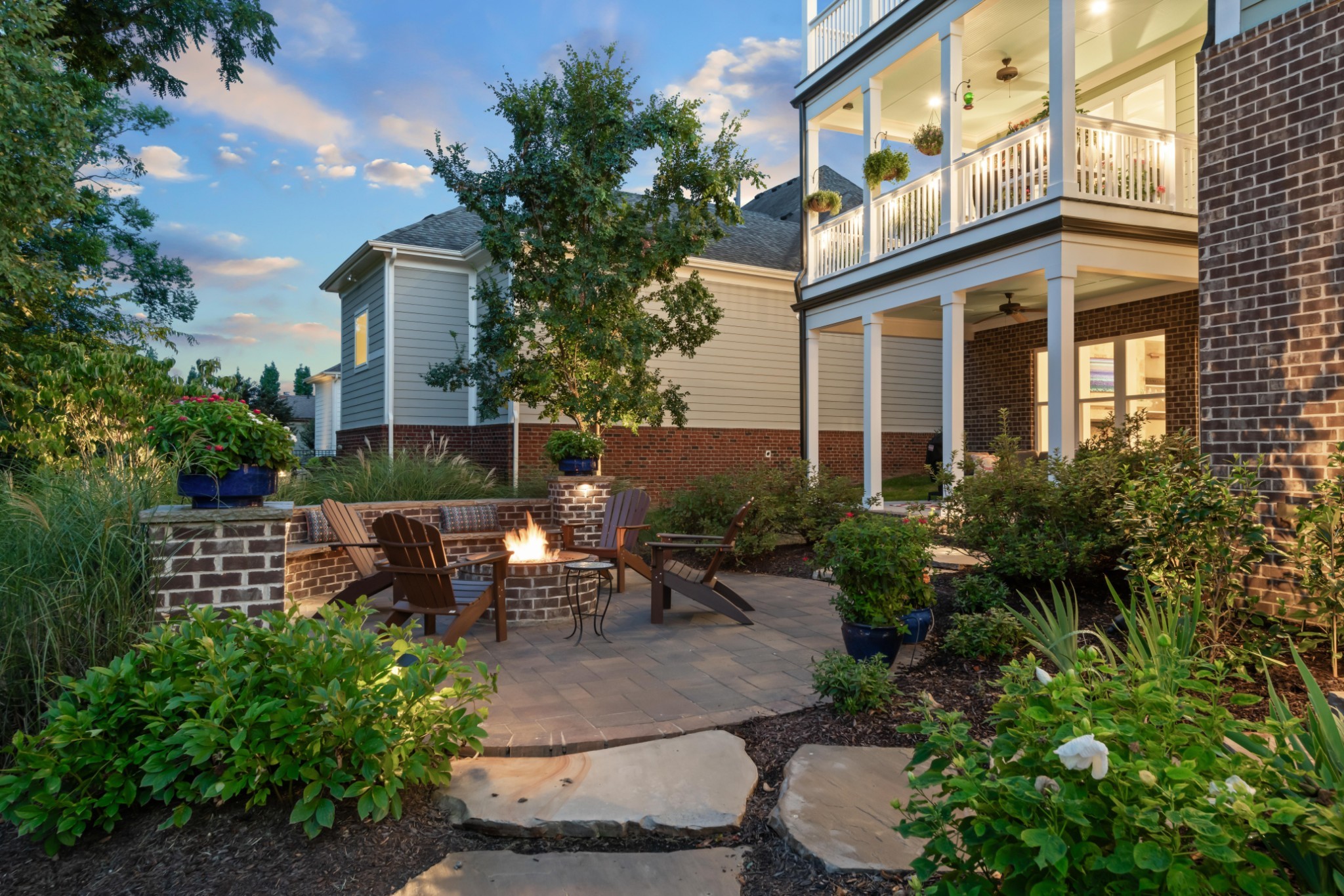 Each of the three floors opens to a fabulous covered outdoor living space. From the top floor balcony, take in sunsets and sweeping rolling hill vistas and fireworks displays. On the main floor, savor a book and coffee on the balcony adjoining the living and dining room. On the ground floor, host indoor-outdoor parties with a fabulous patio, or enjoy privacy by the custom backyard firepit surrounded by lush landscaping. Or, enjoy rocking on the traditional front porch.