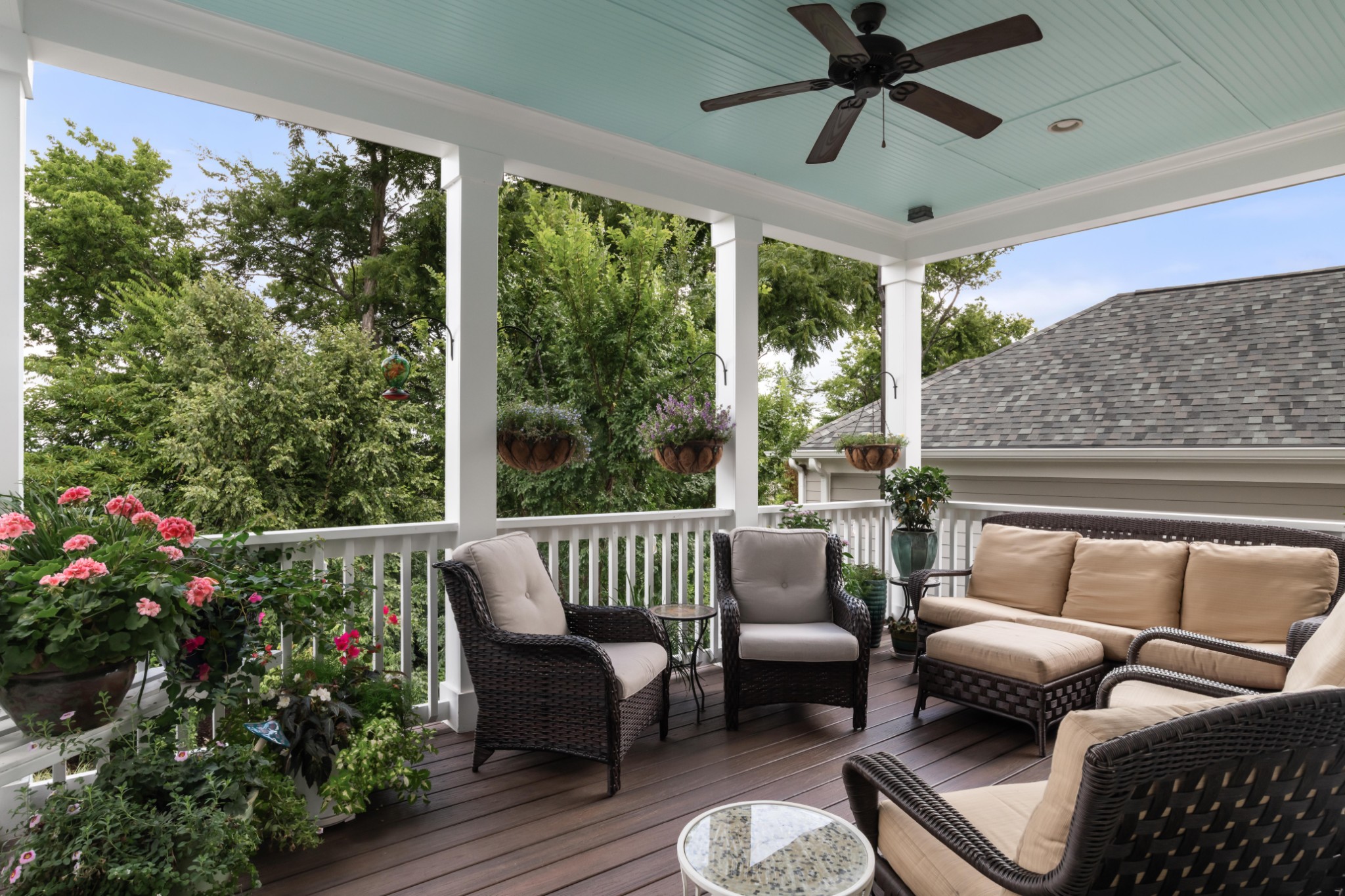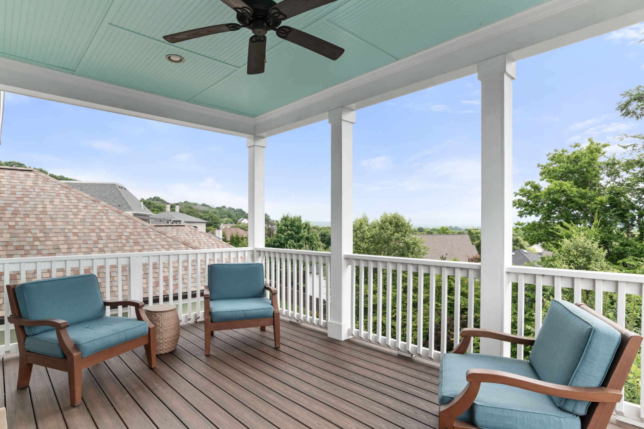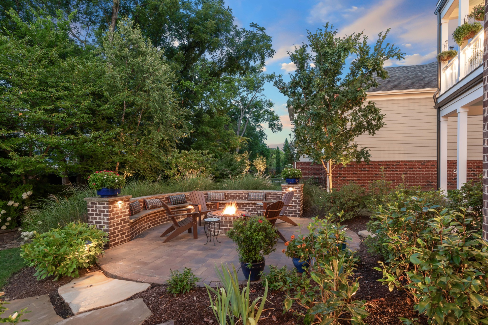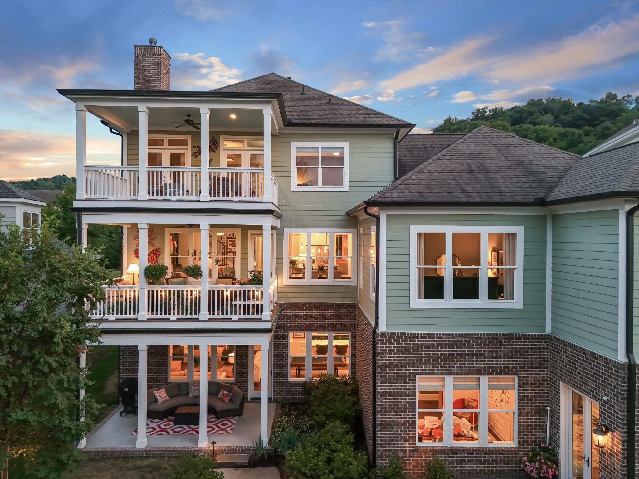Each of the three floors opens to a fabulous covered outdoor living space. From the top floor balcony, take in sunsets and sweeping rolling hill vistas and fireworks displays. On the main floor, savor a book and coffee on the balcony adjoining the living and dining room. On the ground floor, host indoor-outdoor parties with a fabulous patio, or enjoy privacy by the custom backyard firepit surrounded by lush landscaping. Or, enjoy rocking on the traditional front porch.