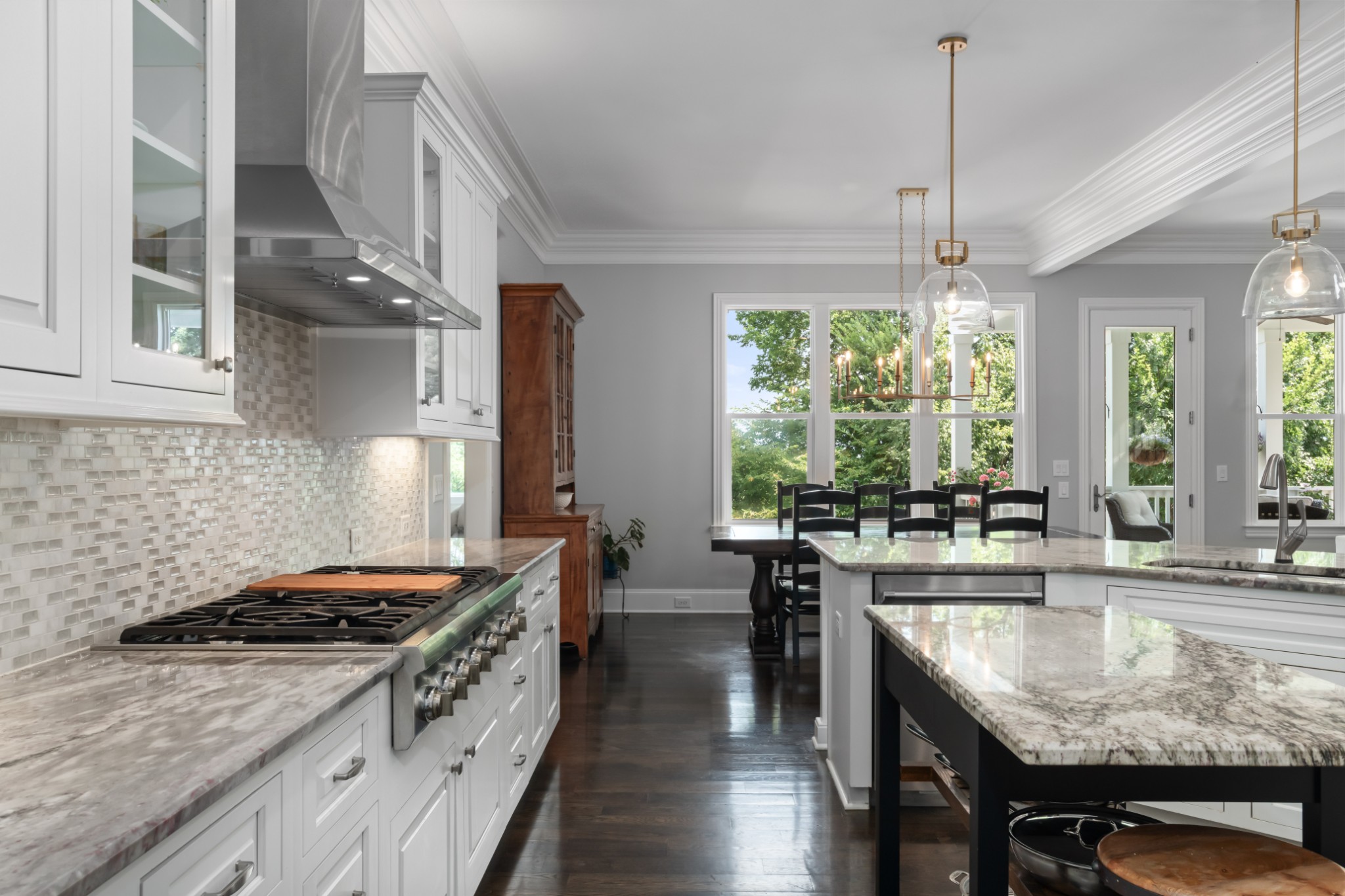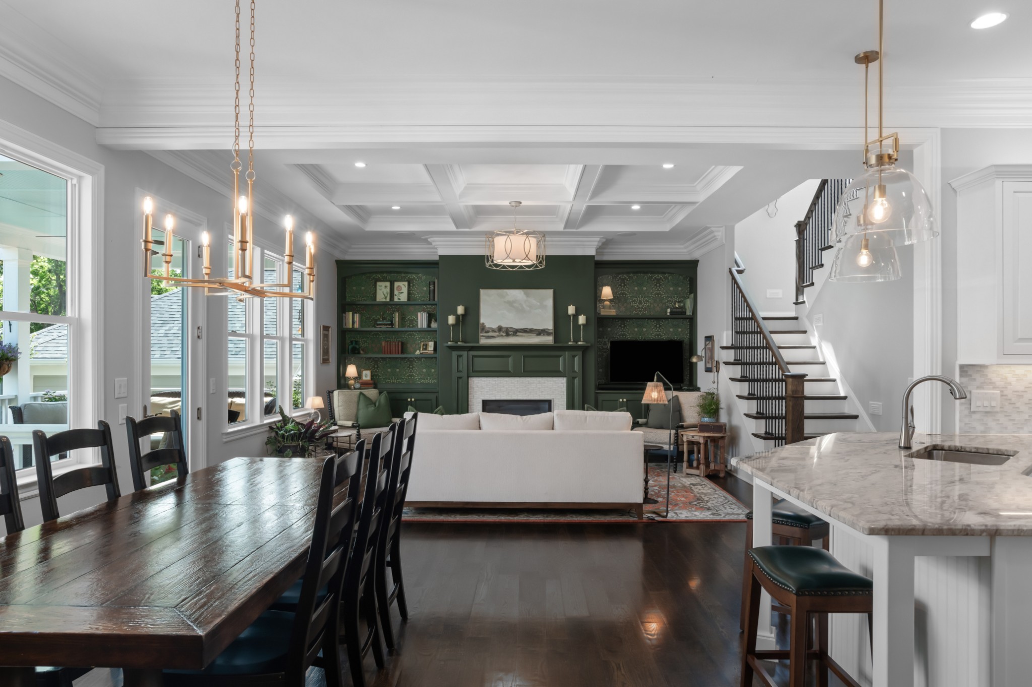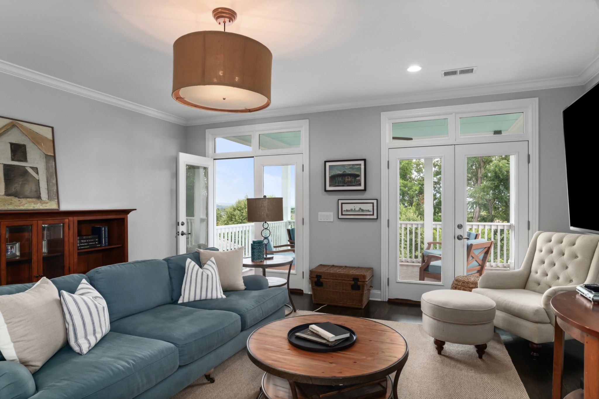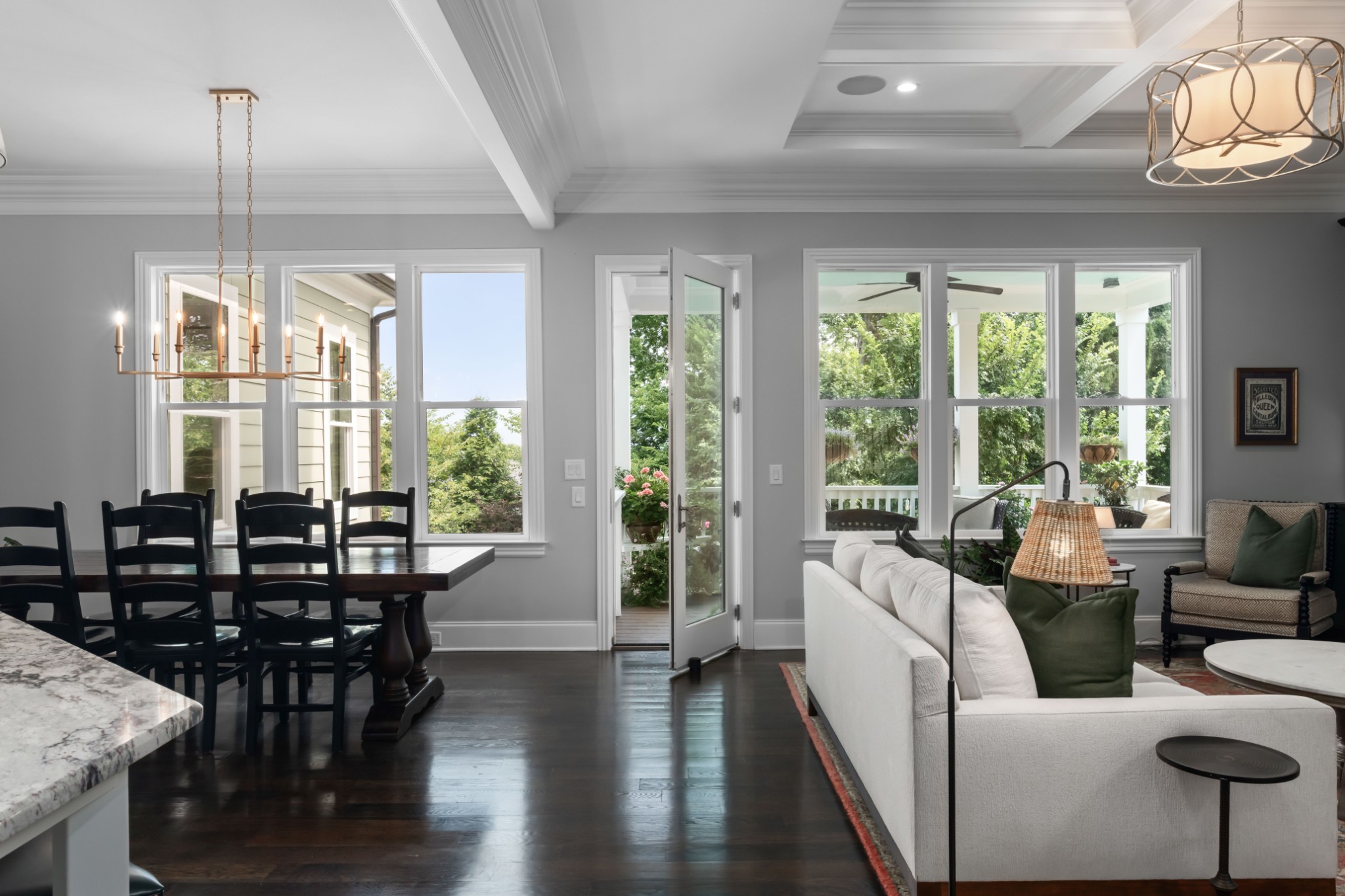 Each of the three floors opens to a fabulous covered outdoor living space. From the top floor balcony, take in sunsets and sweeping rolling hill vistas and fireworks displays. On the main floor, savor a book and coffee on the balcony adjoining the living and dining room. On the ground floor, host indoor-outdoor parties with a fabulous patio, or enjoy privacy by the custom backyard firepit surrounded by lush landscaping. Or, enjoy rocking on the traditional front porch.